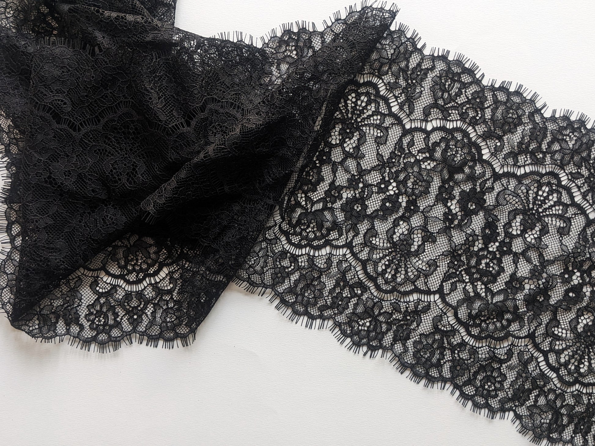Délicate dentelle à cils non extensible, noire. Largeur 20 cm