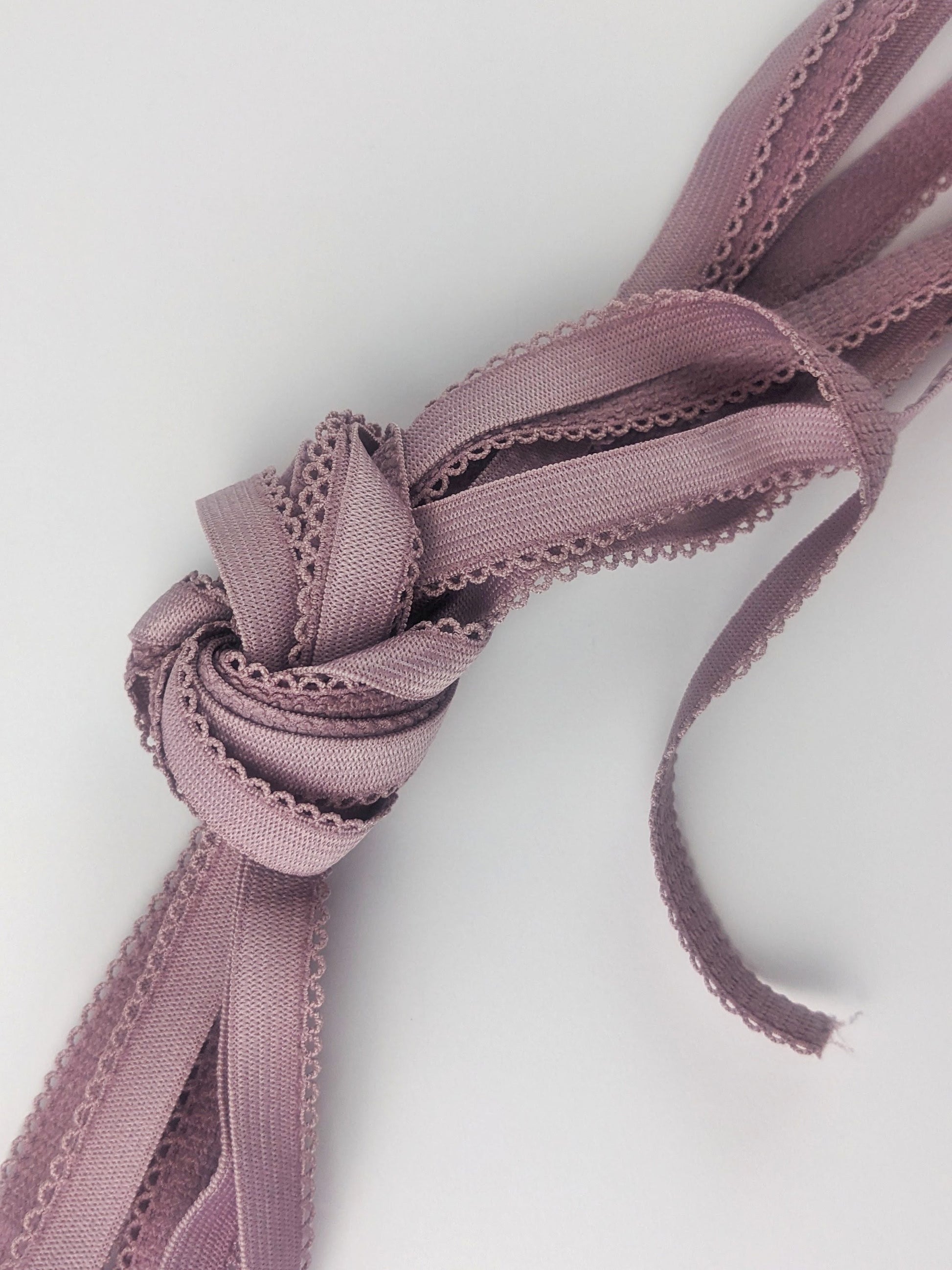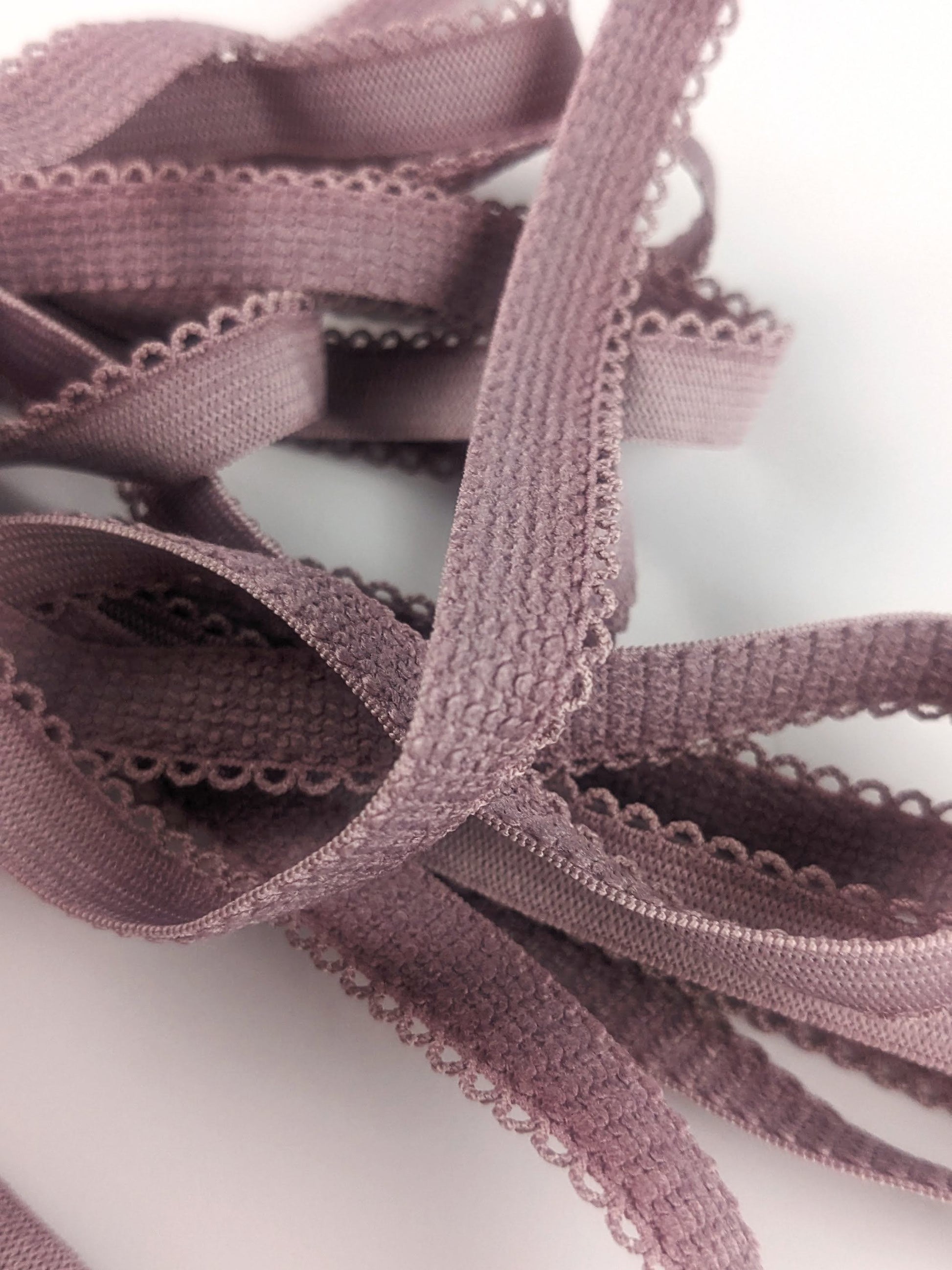 Coupon de 500cm d'élastique à picot parme, largeur 10mm. Face douce, assez ferme, idéal pour les sous-bras ou la bande sous poitrine d'un soutien-gorge.