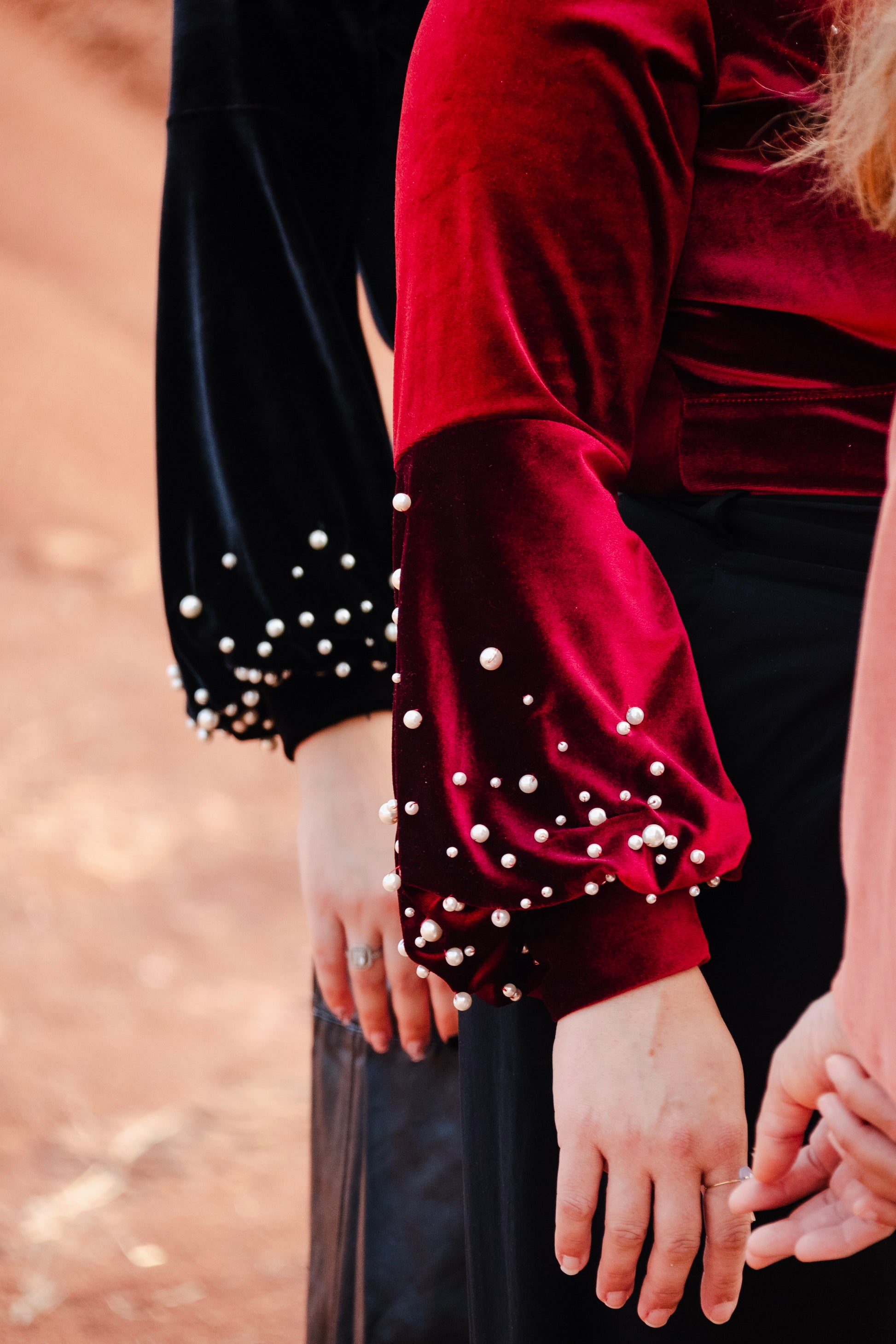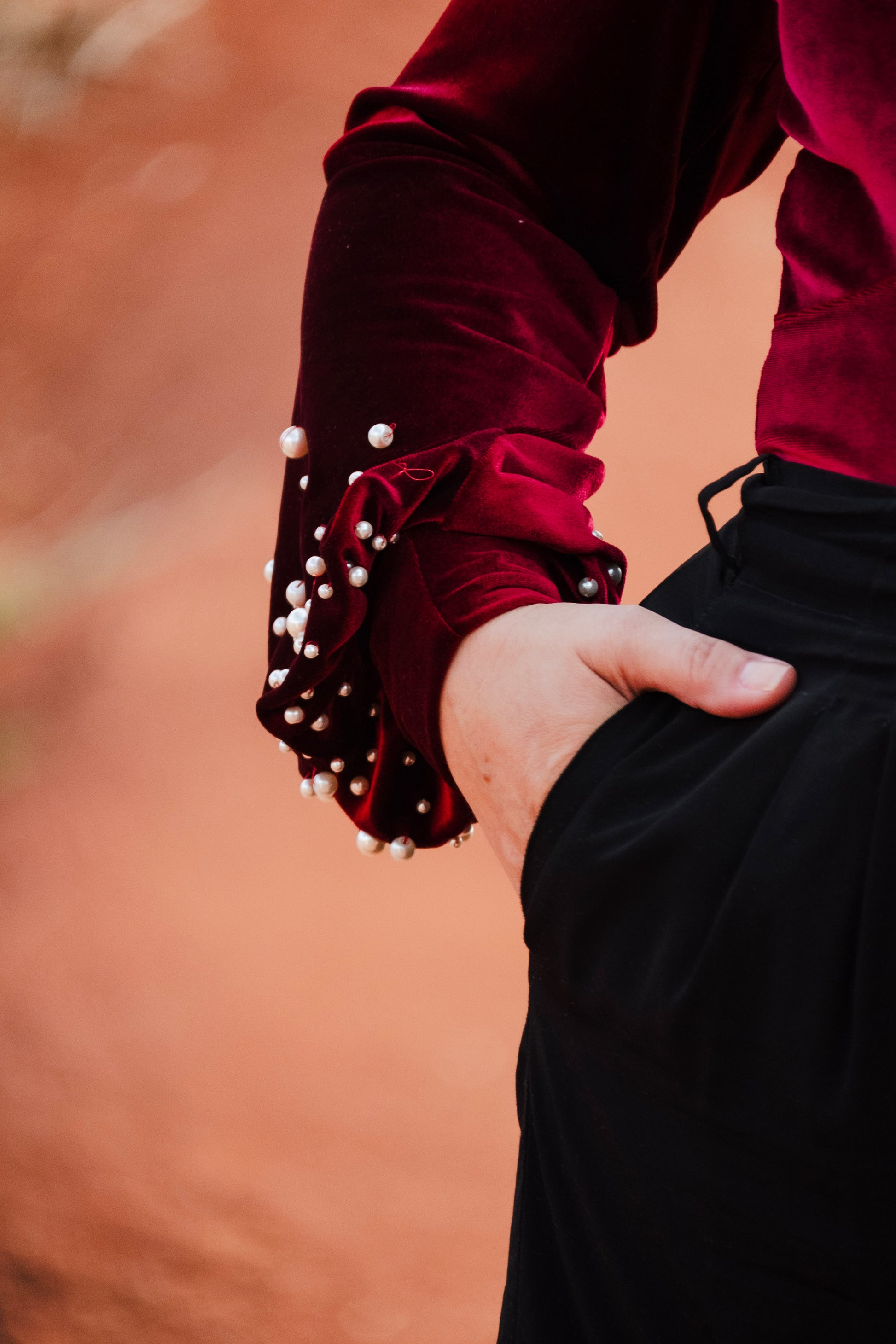 Le kit Poesis velours vous permettra de coudre la version A avec les manches bishop ou évasées, avec ou sans fermeture à pressions. Chaque kit contient :