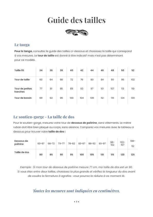 Les mesures sont indiquées en cm / mm. Les marges de coutures sont incluses dans le patron.